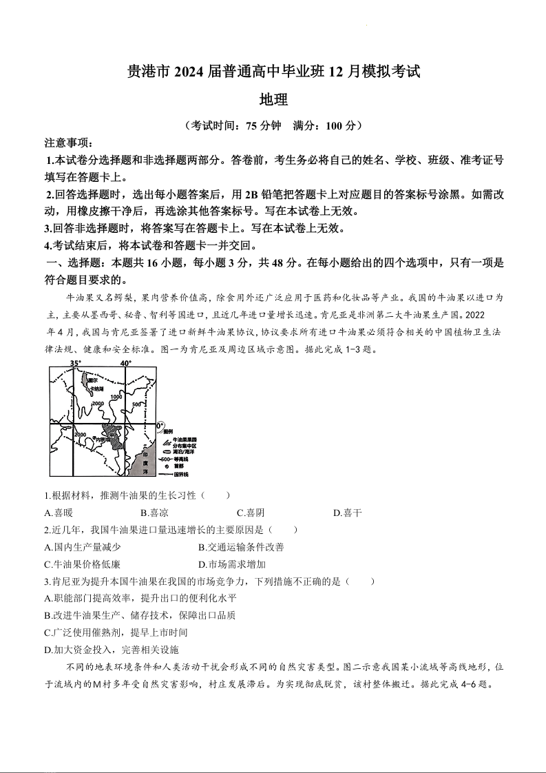 广西省贵港市2024届高三上学期12月模拟考试地理