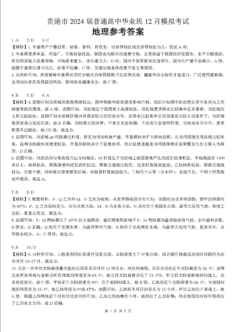 广西省贵港市2024届高三上学期12月模拟考试地理答案