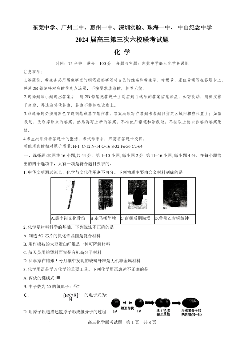广东省六校2024届高三上学期第三次联考化学+答案