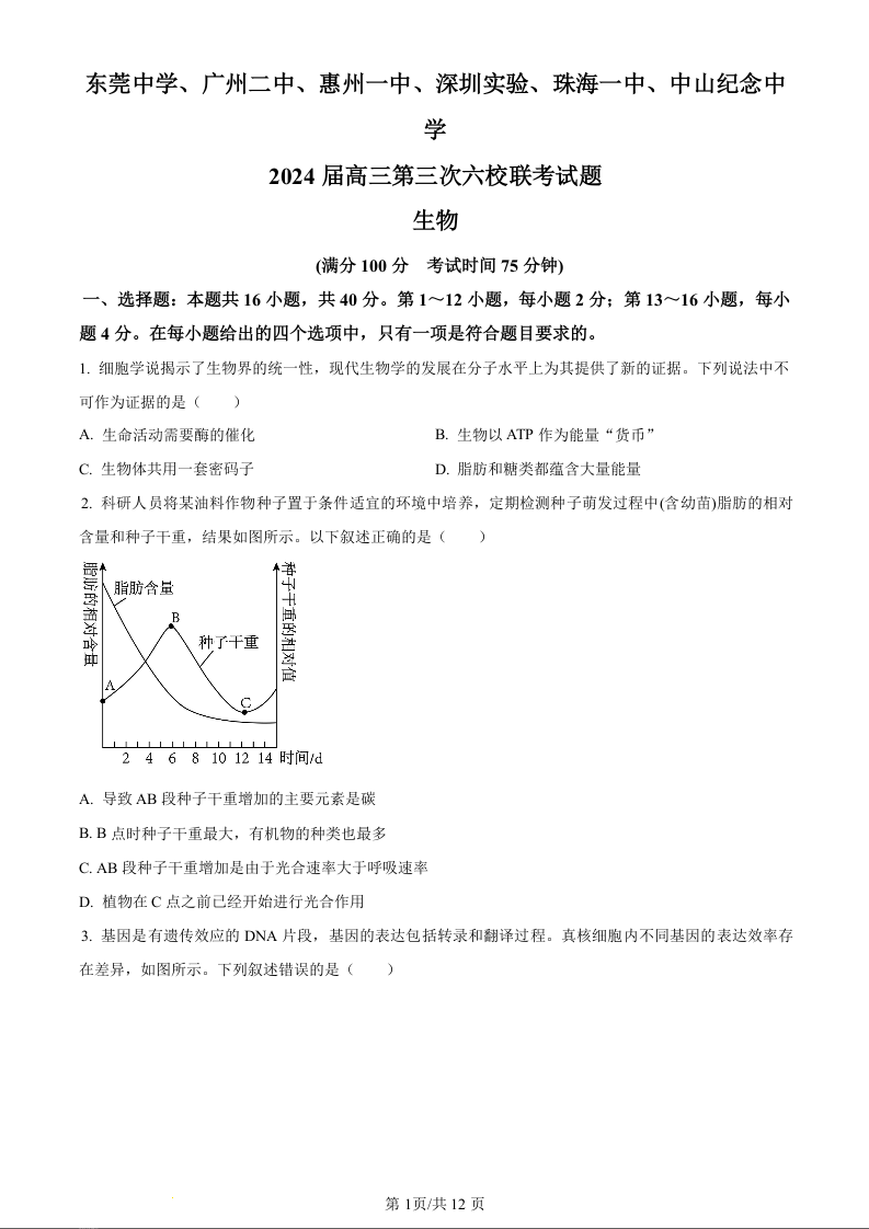 广东省六校2024届高三上学期第三次联考生物(原卷版)