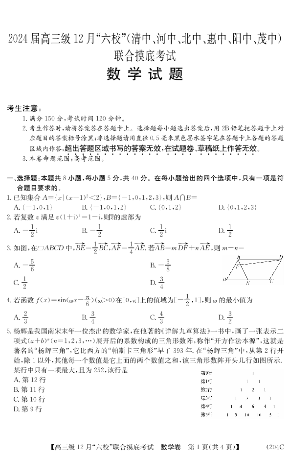 广东省六校2024届高三上学期12月联合摸底考试数学