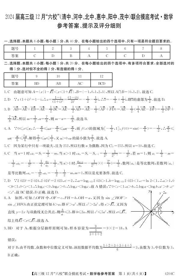 广东省六校2024届高三上学期12月联合摸底考试数学答案