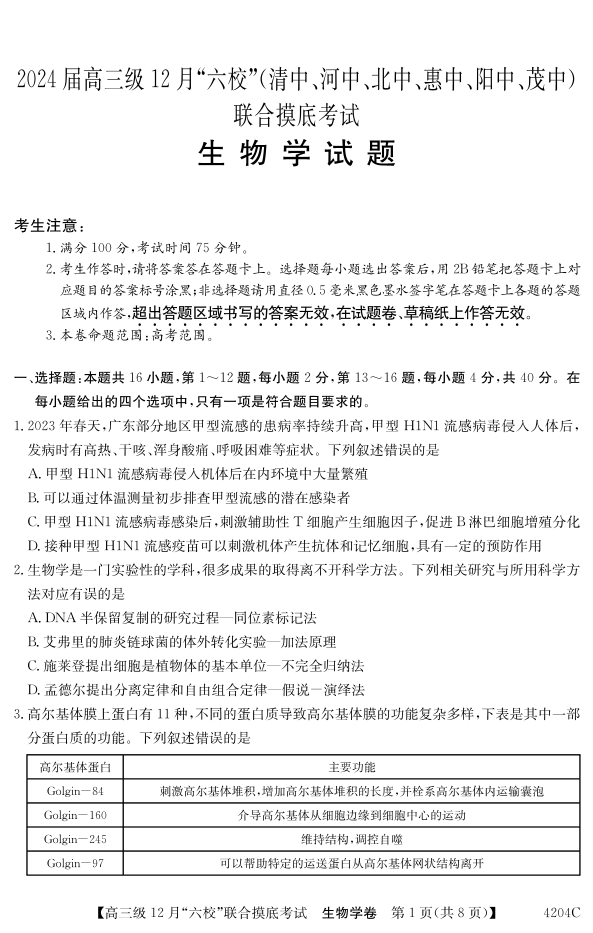 广东省六校2024届高三上学期12月联合摸底考试生物