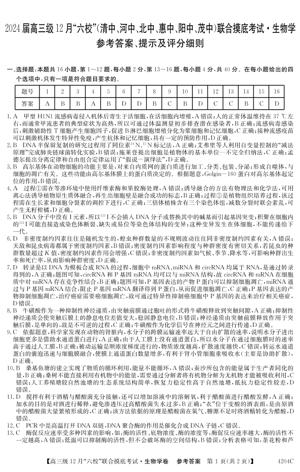 广东省六校2024届高三上学期12月联合摸底考试生物答案