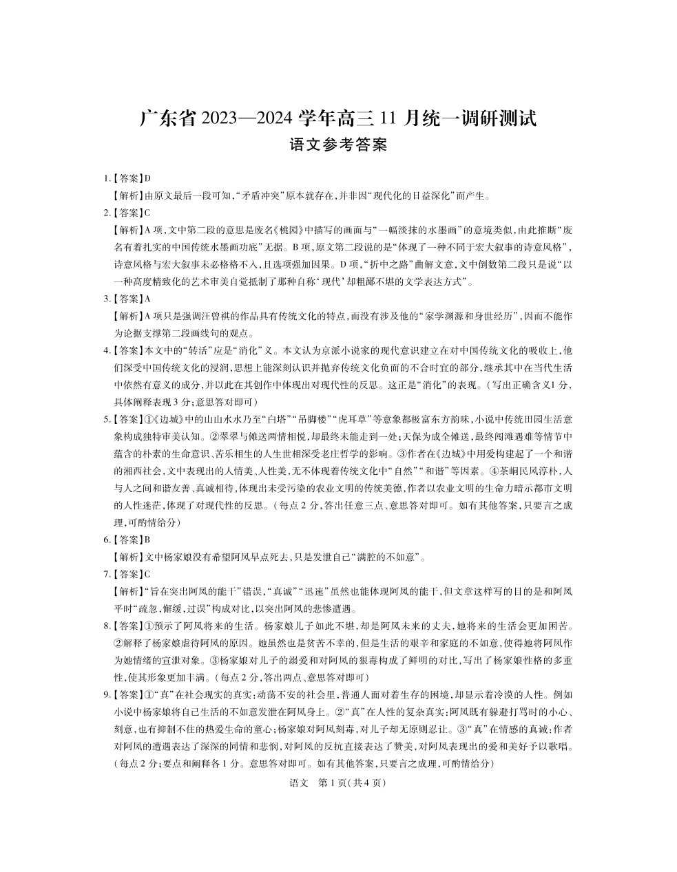 广东省2023-2024学年高三上学期11月统一调研测试语文答案