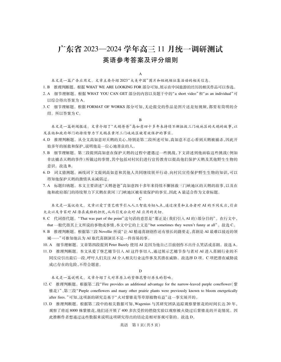 广东省2023-2024学年高三上学期11月统一调研测试英语答案