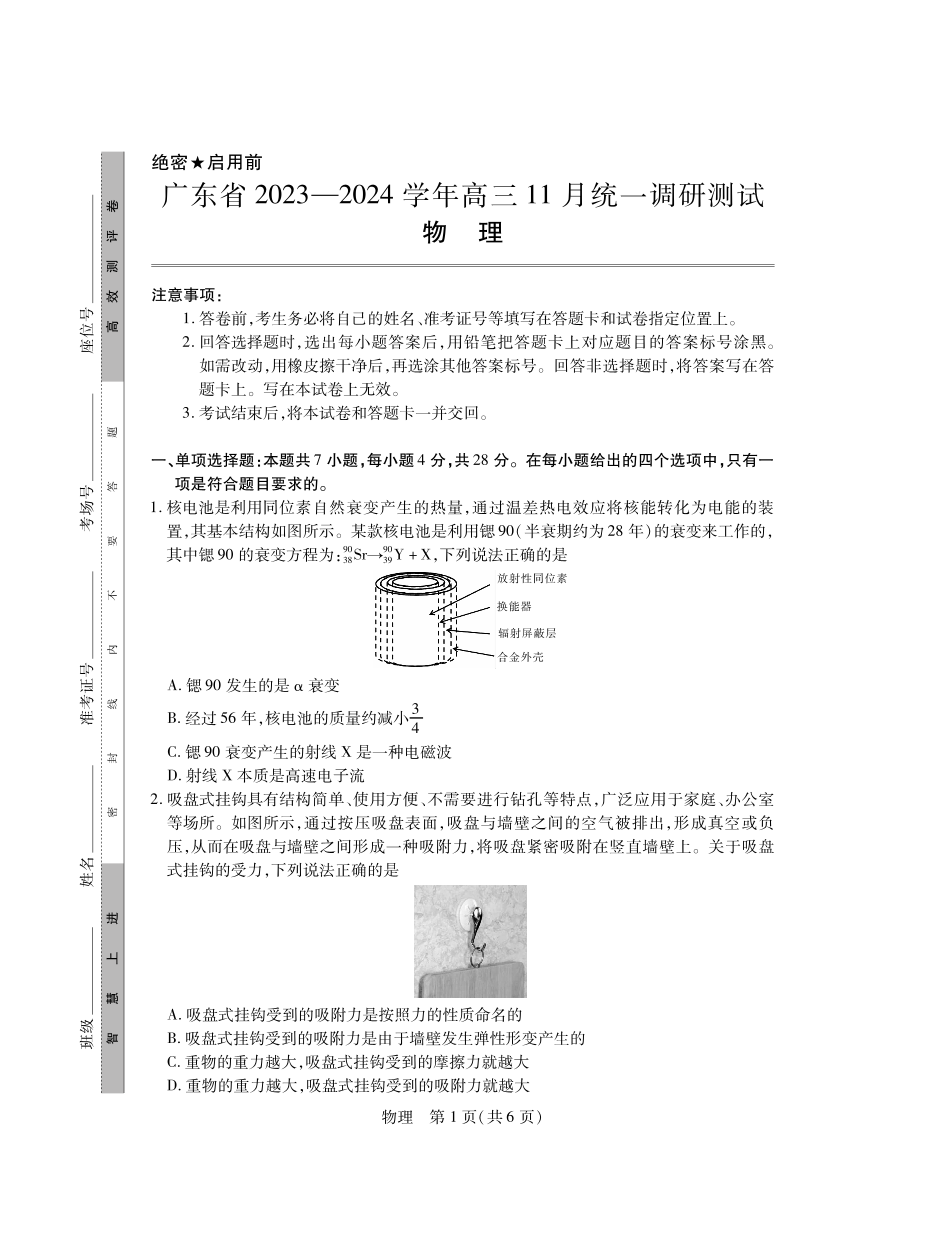 广东省2023-2024学年高三上学期11月统一调研测试物理