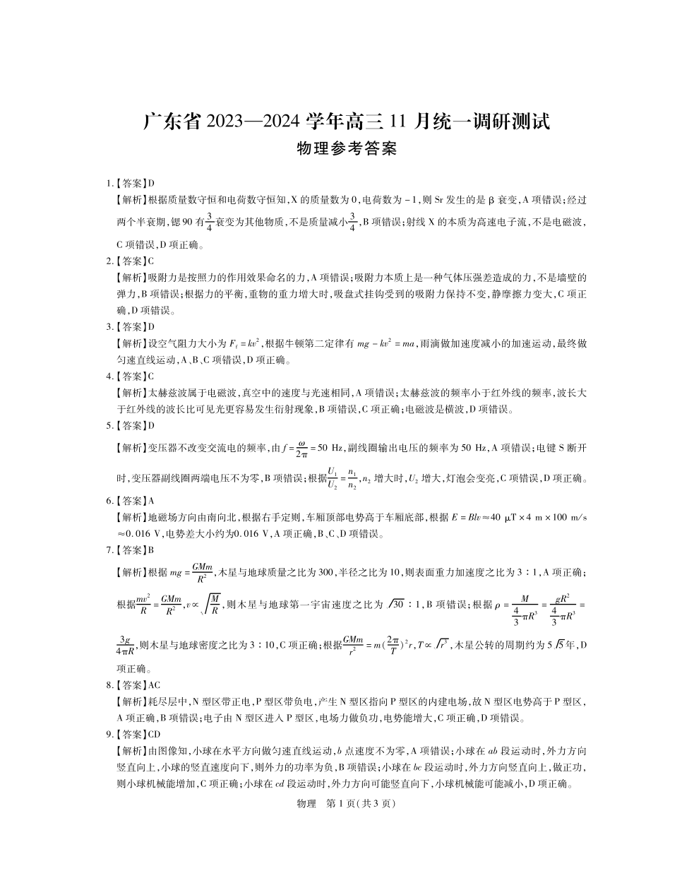 广东省2023-2024学年高三上学期11月统一调研测试物理答案
