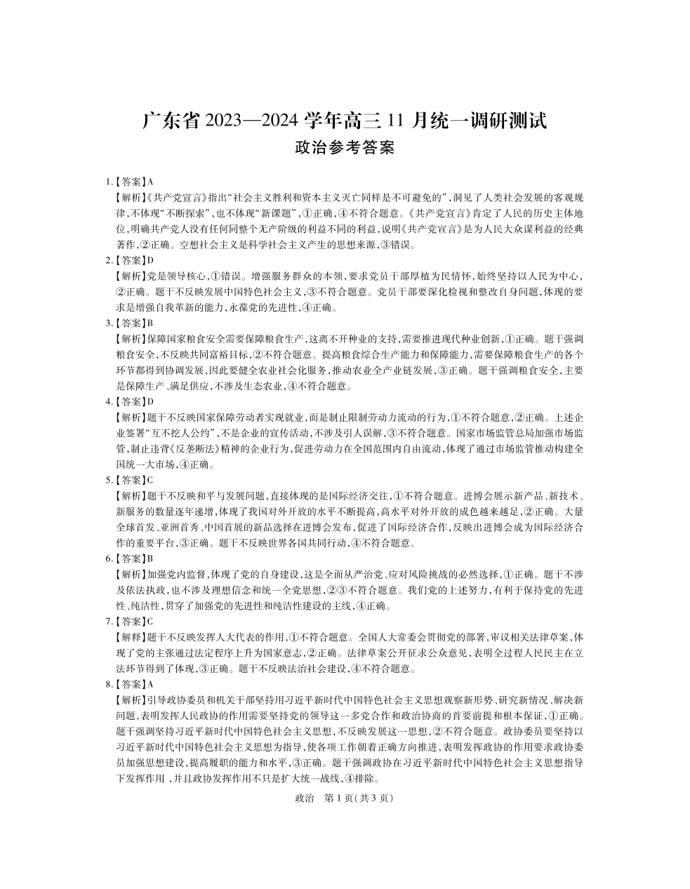广东省2023-2024学年高三上学期11月统一调研测试政治答案