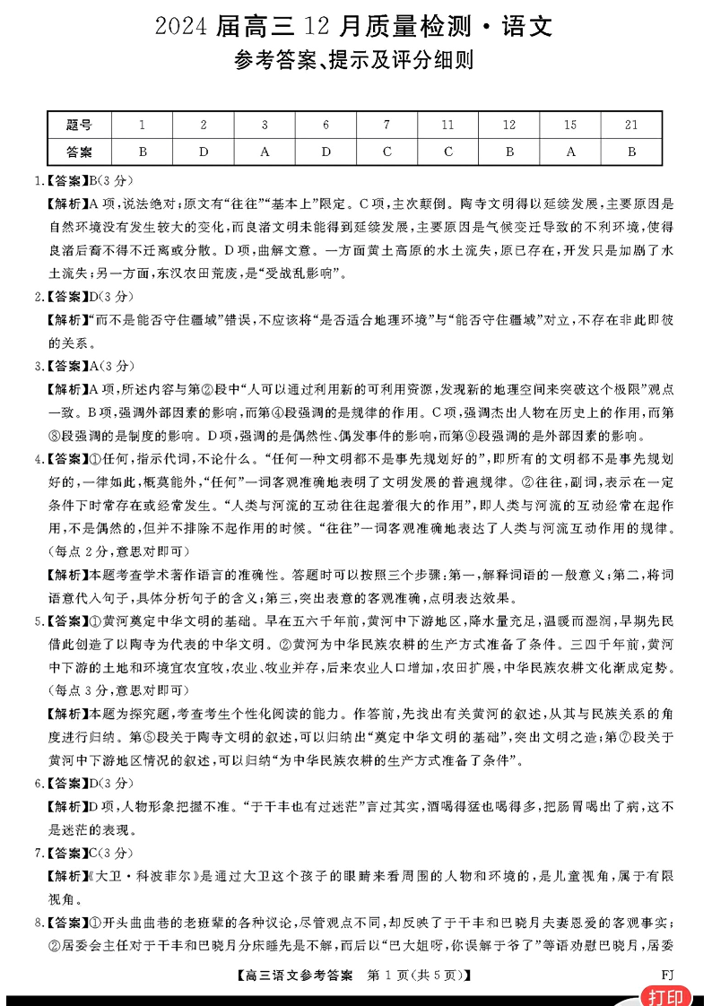 福建省百校联考(金科大联考)2024届高三上学期12月月考语文答案