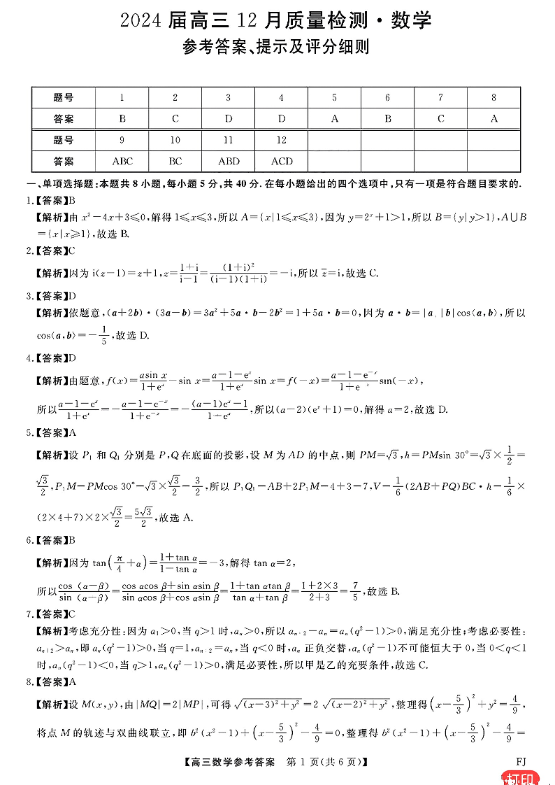 福建省百校联考(金科大联考)2024届高三上学期12月月考数学答案