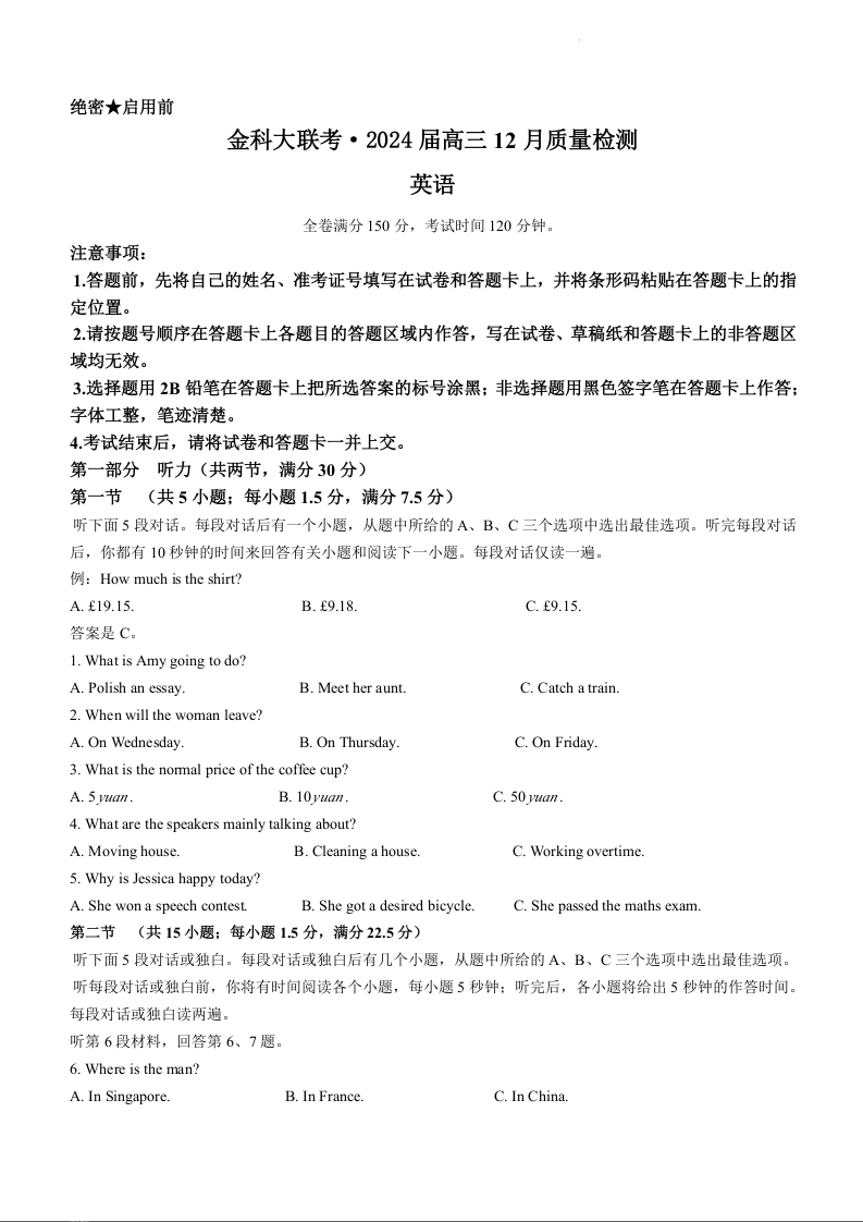 福建省百校联考(金科大联考)2024届高三上学期12月月考英语
