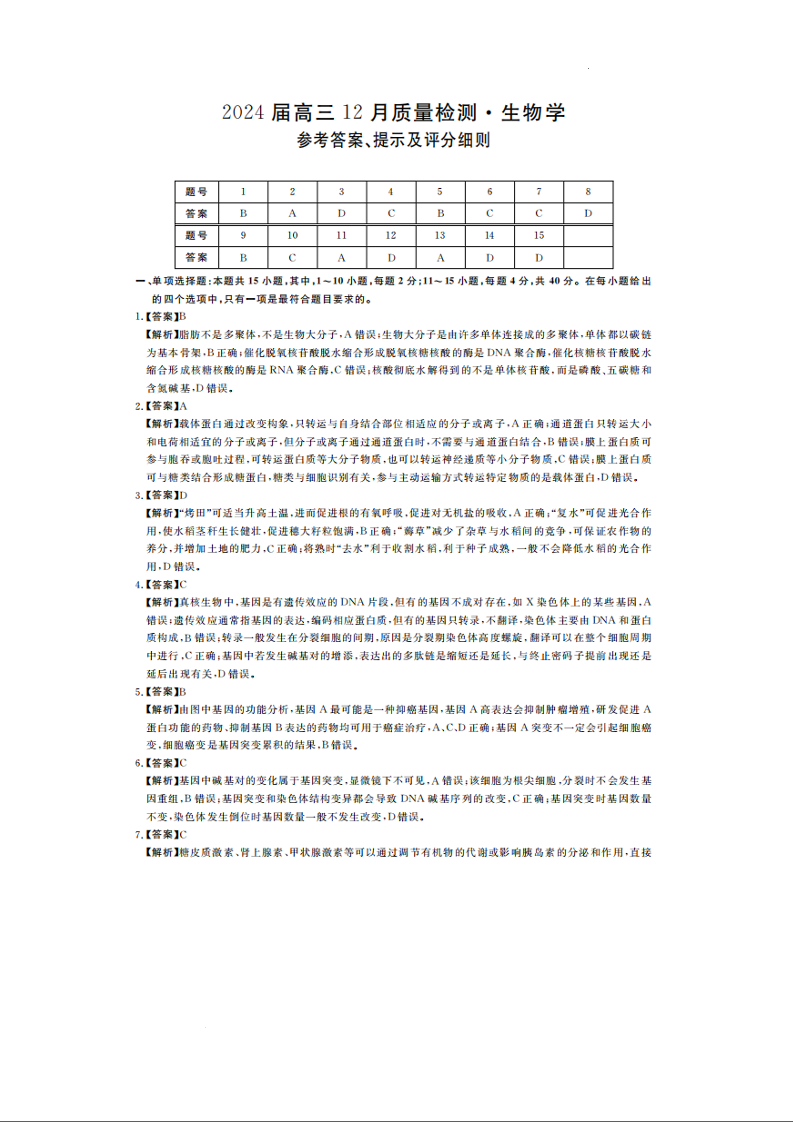 福建省百校联考(金科大联考)2024届高三上学期12月月考生物答案