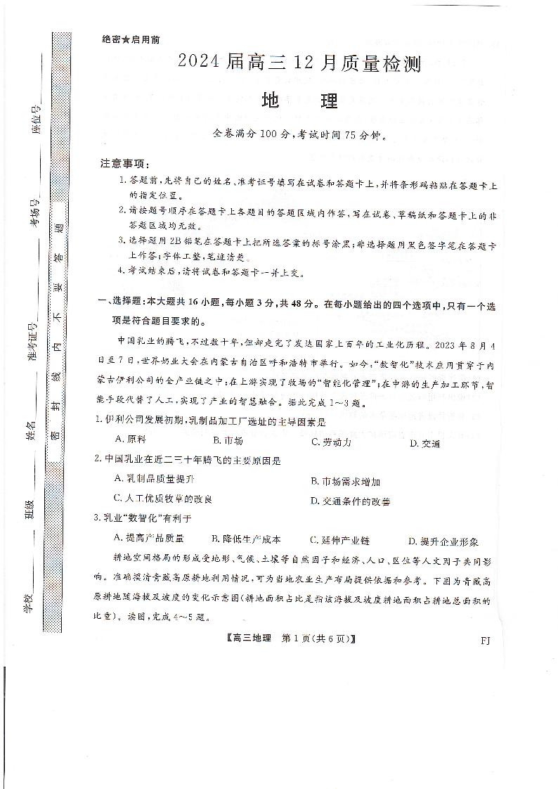 福建省百校联考(金科大联考)2024届高三上学期12月月考地理
