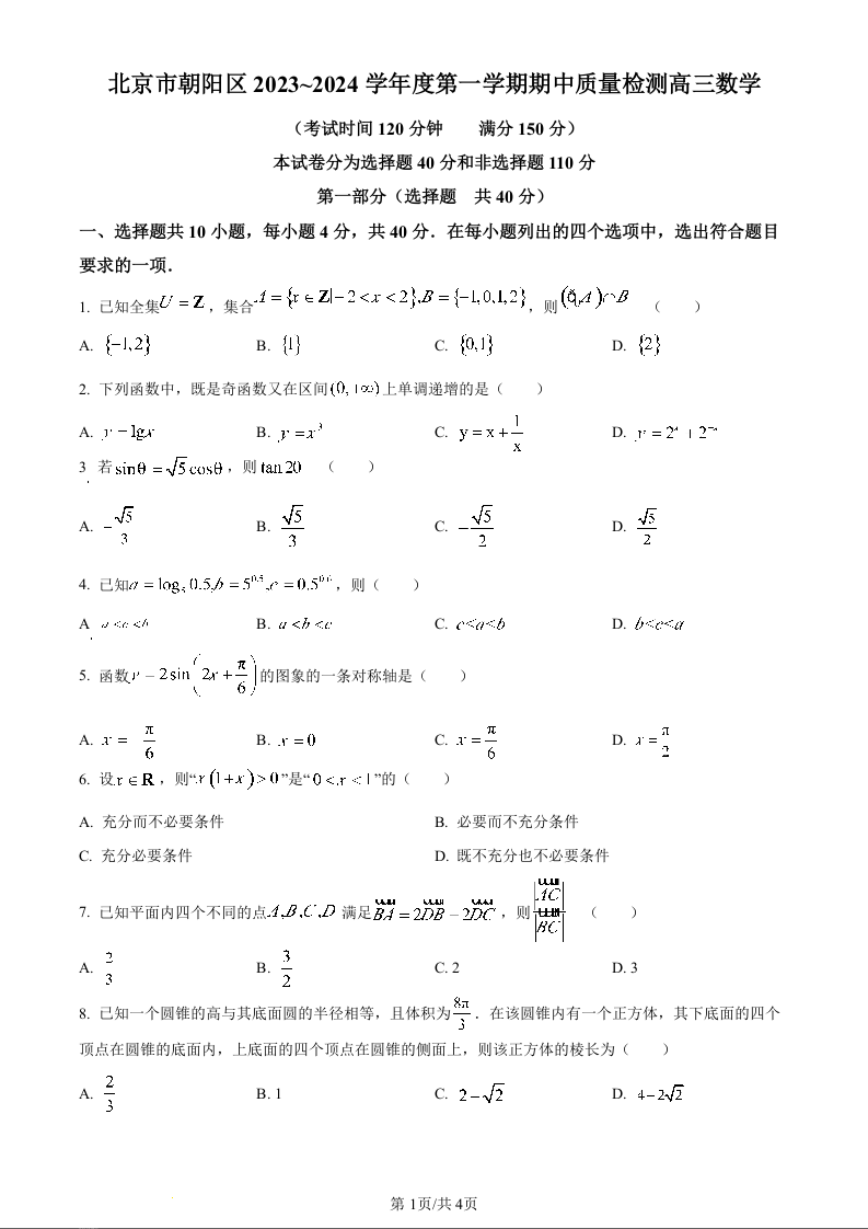北京市朝阳区2024届高三上学期期中考试数学(原卷版)