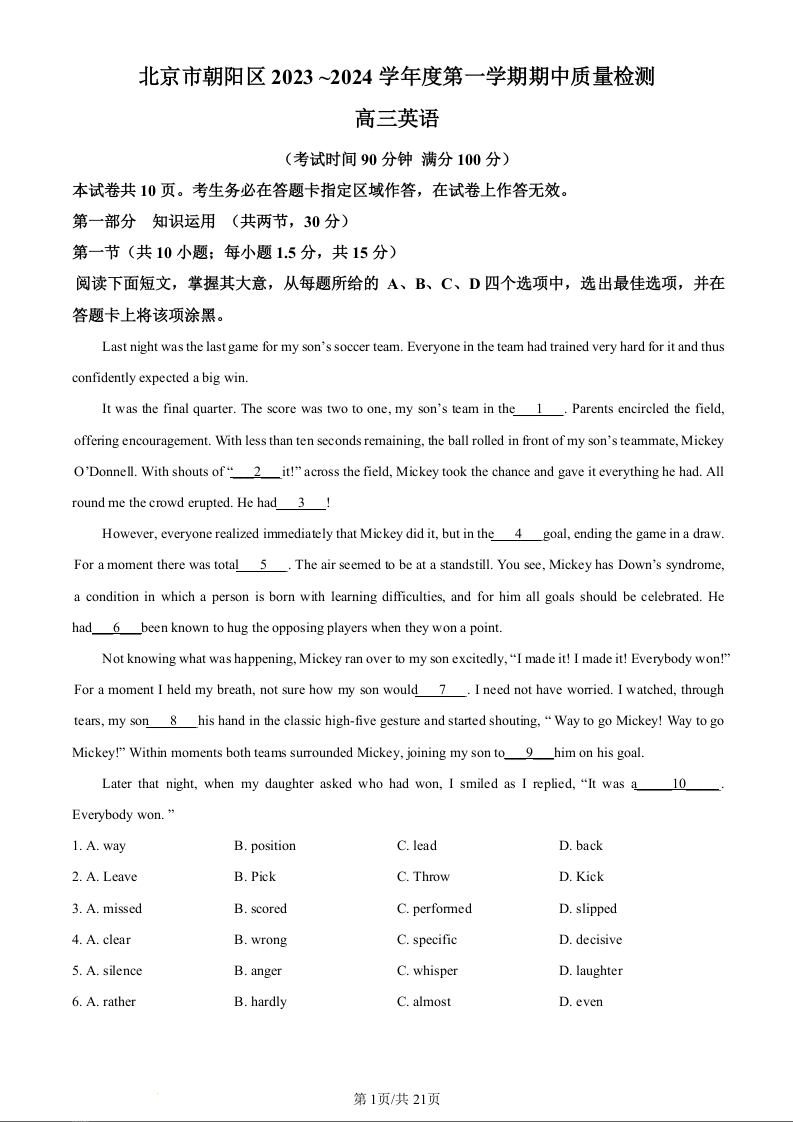 北京市朝阳区2024届高三上学期期中考试英语(精品解析版)