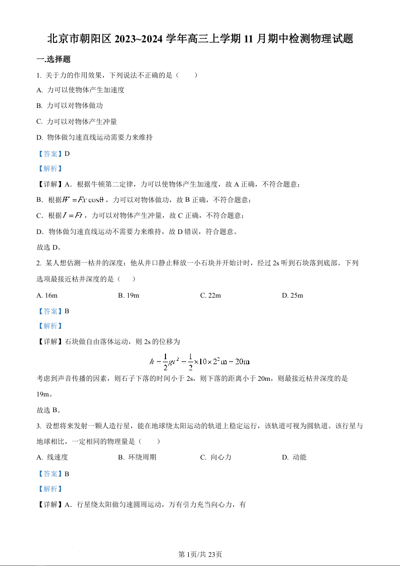 北京市朝阳区2024届高三上学期期中考试物理(精品解析版)