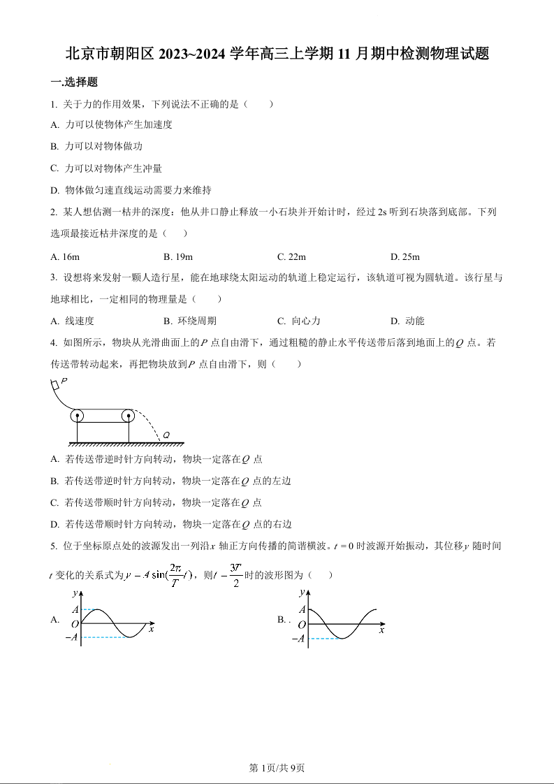 北京市朝阳区2024届高三上学期期中考试物理(原卷版)