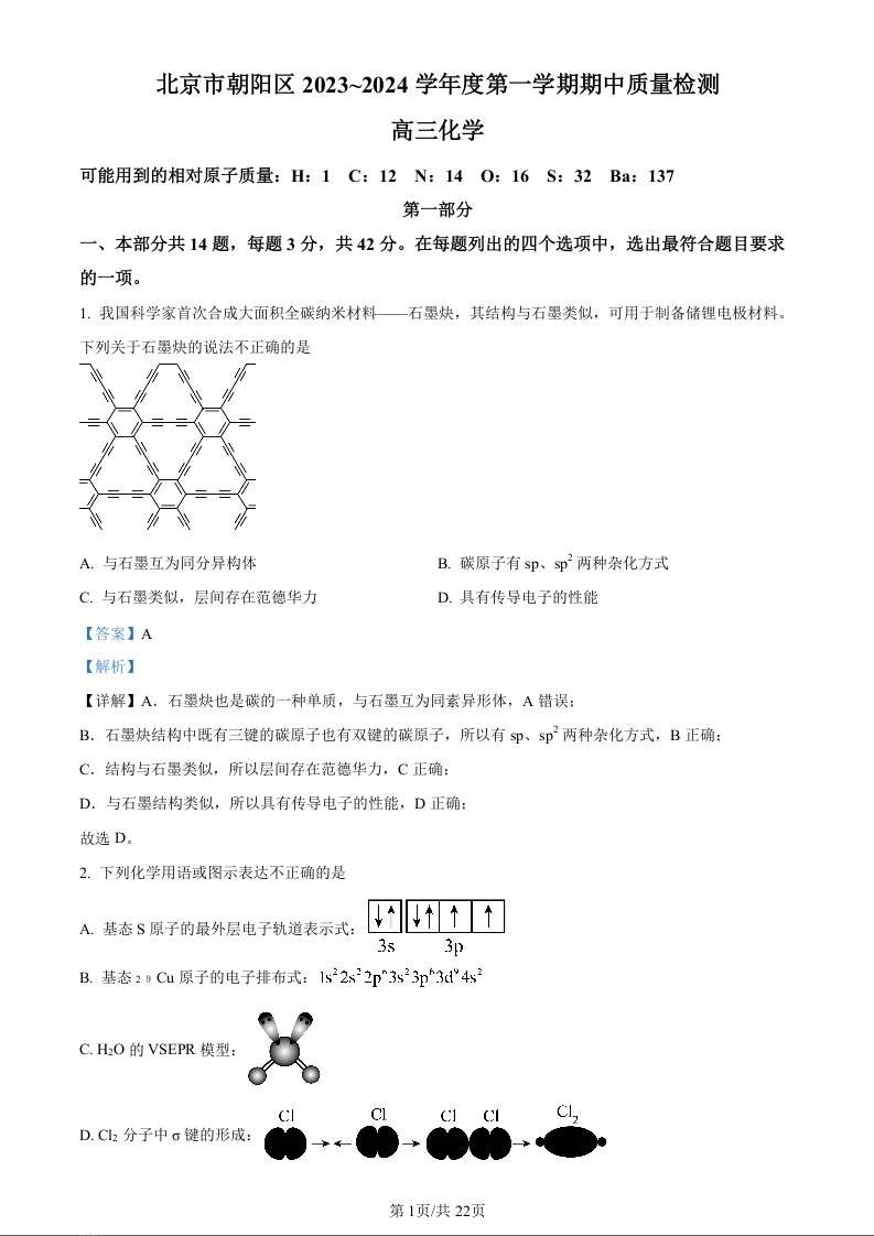 北京市朝阳区2024届高三上学期期中考试化学(精品解析版)