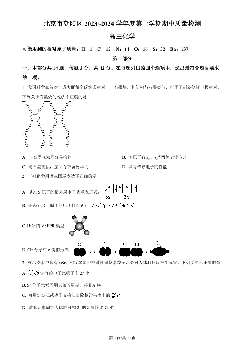 北京市朝阳区2024届高三上学期期中考试化学(原卷版)