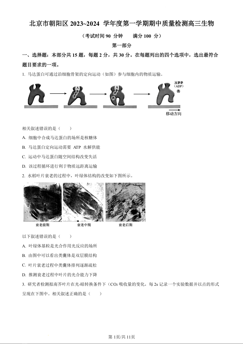 北京市朝阳区2024届高三上学期期中考试生物(原卷版)