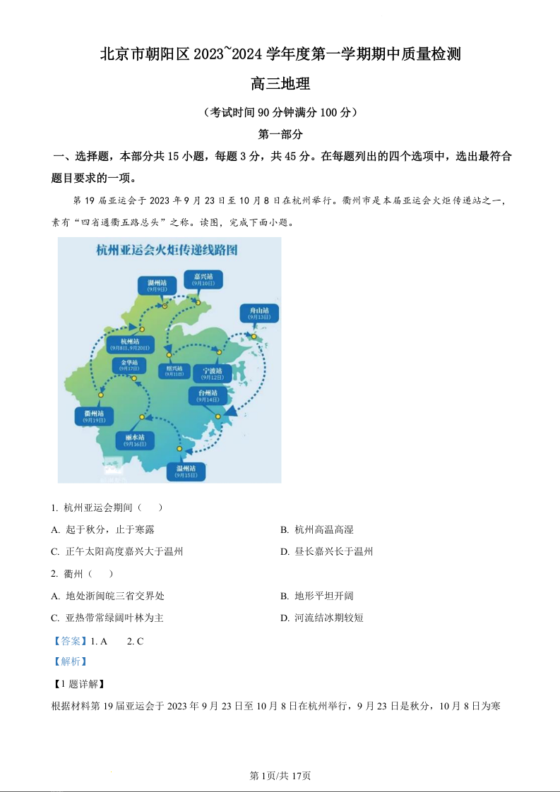 北京市朝阳区2024届高三上学期期中考试地理(精品解析版)
