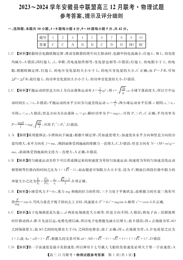 安徽省县中联盟2024届高三上学期12月联考物理答案