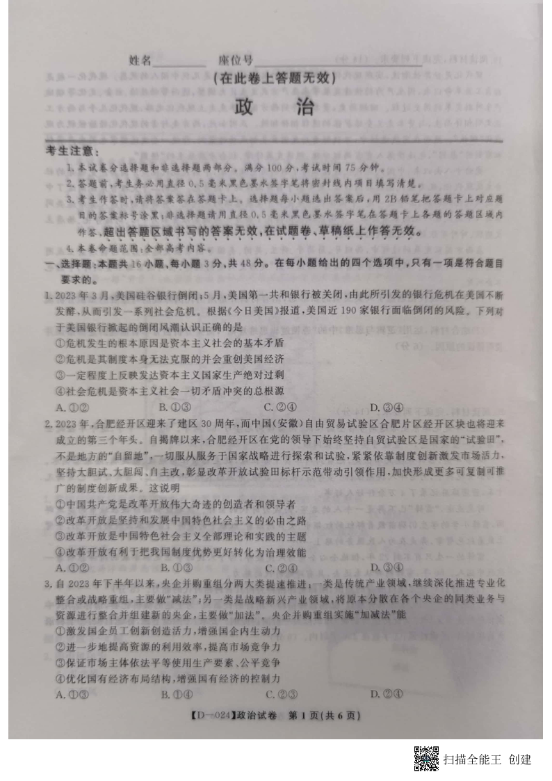 安徽省皖江名校联盟2024届高三上学期12月月考政治