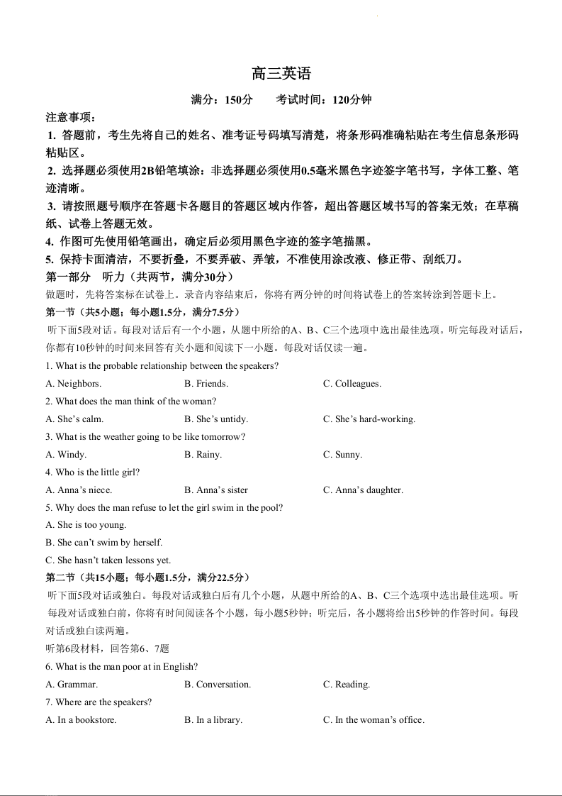 安徽省名校联盟2024届高三12月大联考英语+答案
