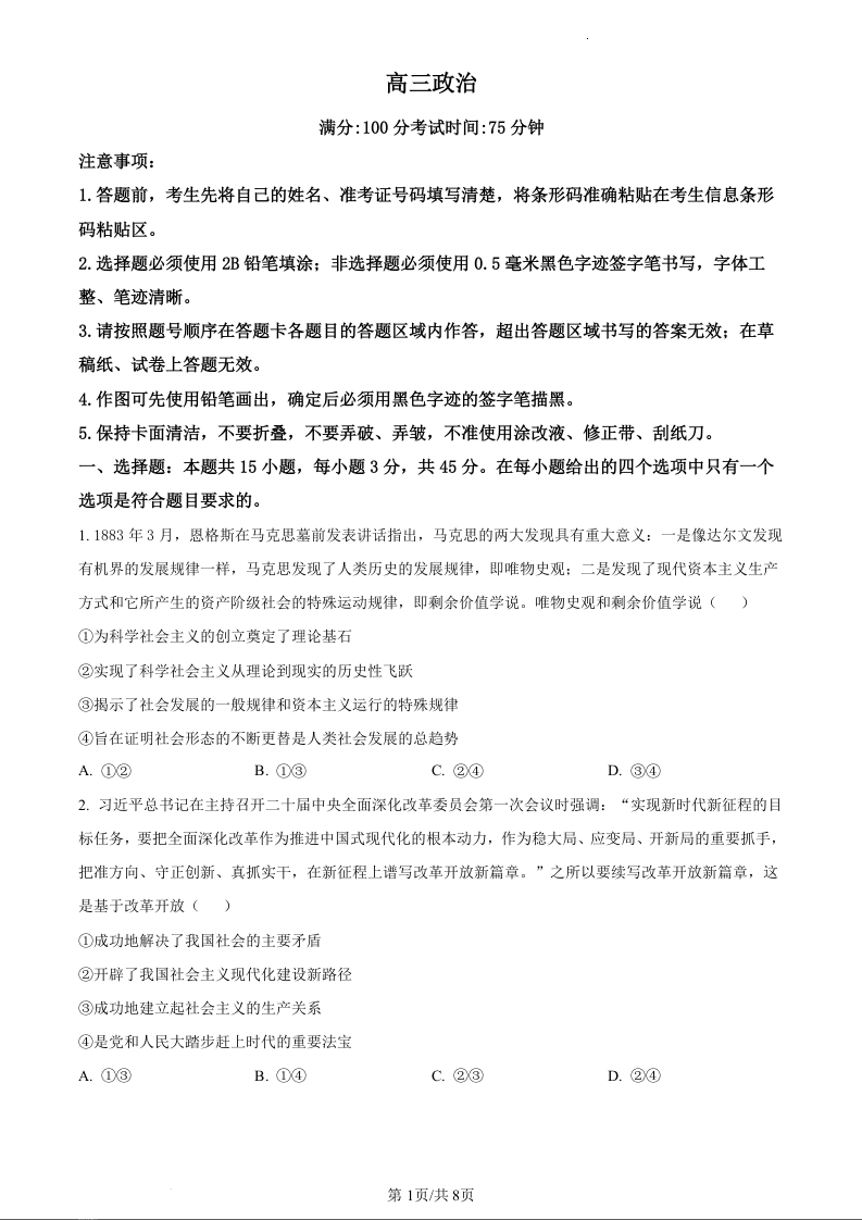 安徽省名校联盟2024届高三12月大联考政治(原卷版)