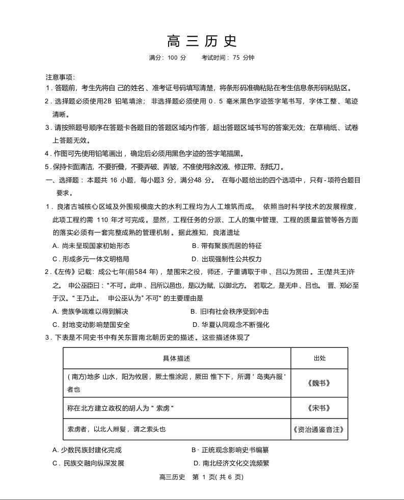 安徽省名校联盟2024届高三12月大联考历史