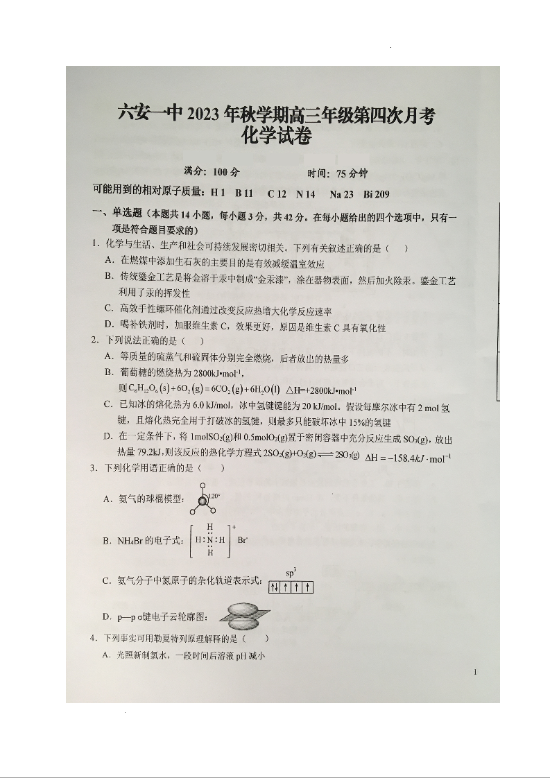 安徽省六安第一中学2024届高三上学期12月月考化学+答案