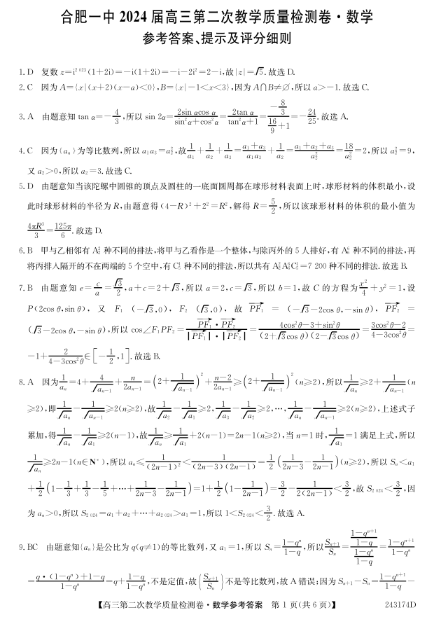 安徽省合肥市一中2024届高三上学期第二次教学质量检测数学答案