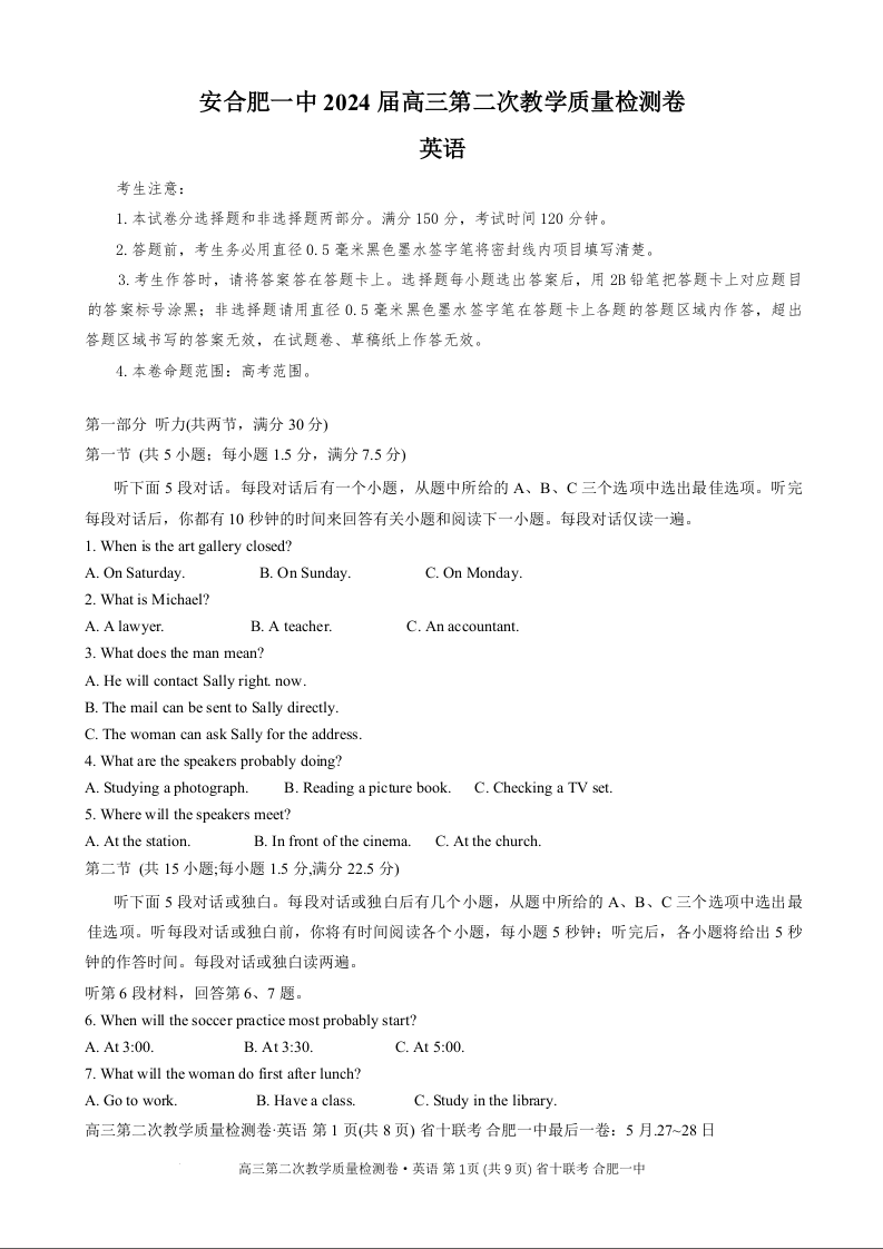 安徽省合肥市一中2024届高三上学期第二次教学质量检测英语
