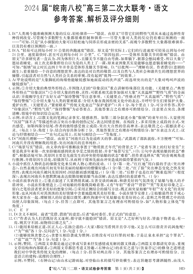 安徽省2024届皖南八校高三第二次大联考语文答案