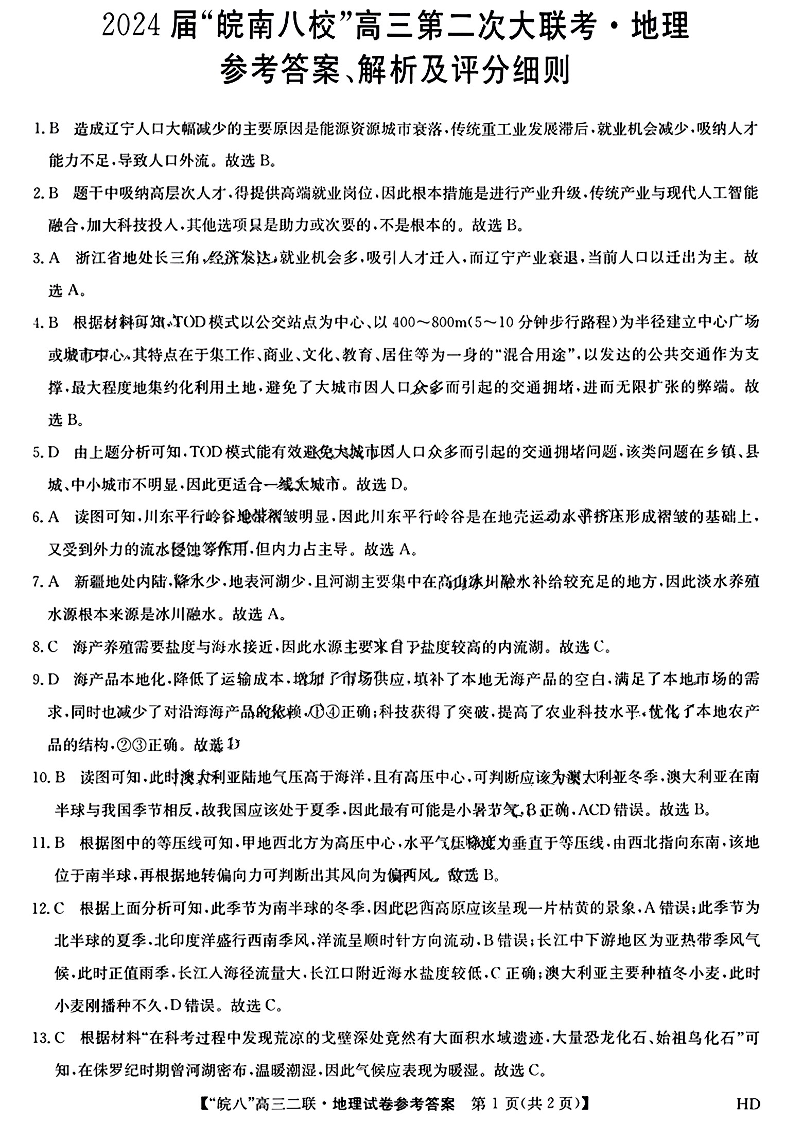 安徽省2024届皖南八校高三第二次大联考地理答案