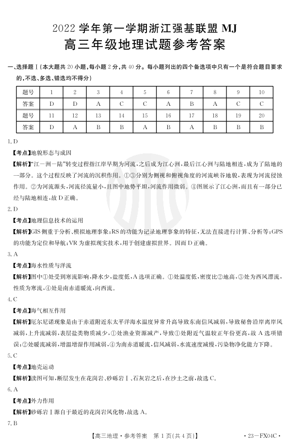 高三地理答案--浙江省强基联盟2023届高三上学期选考仿真密卷
