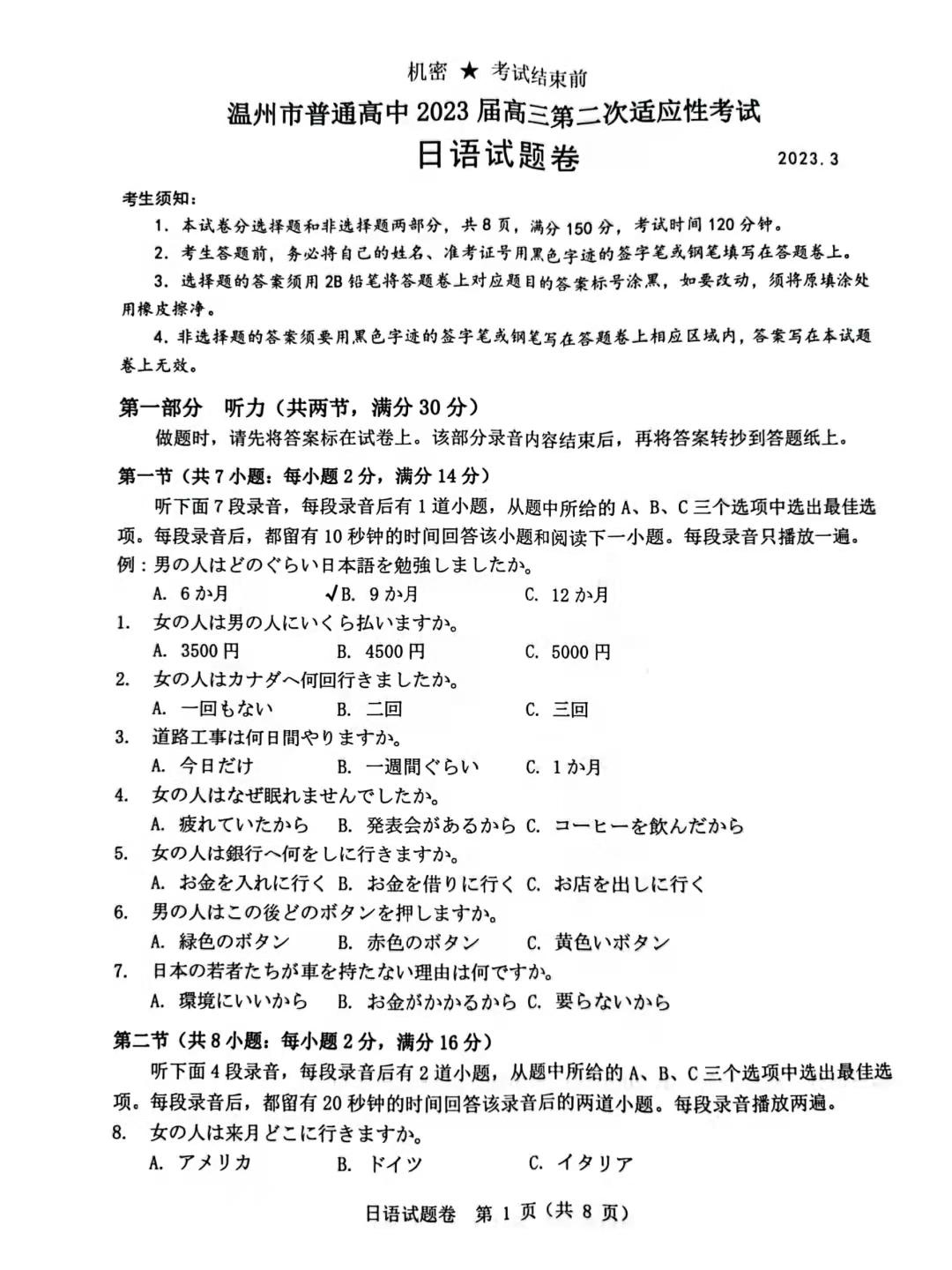 高三日语--浙江省温州市普通高中2023届高三第二次适应性考试