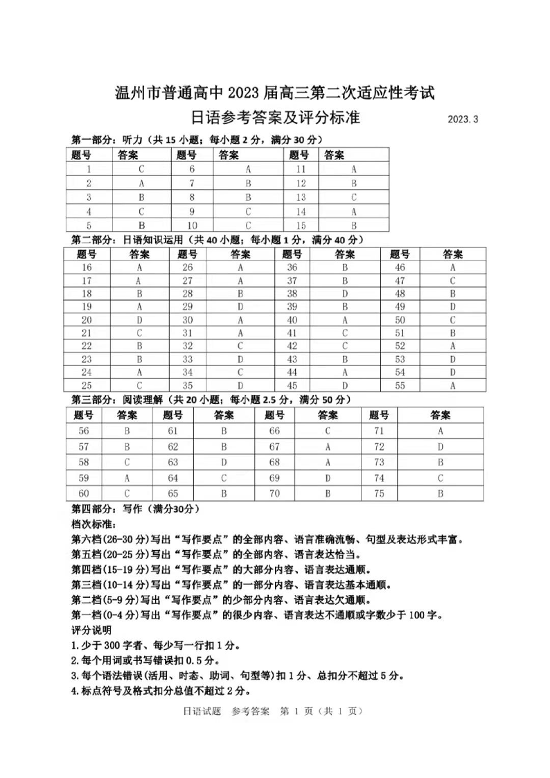 高三日语答案--浙江省温州市普通高中2023届高三第二次适应性考试