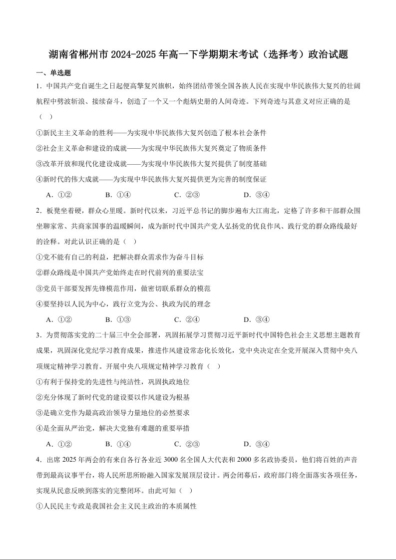 高一政治+答案--湖南省郴州市2024-2025学年高一下学期期末考试
