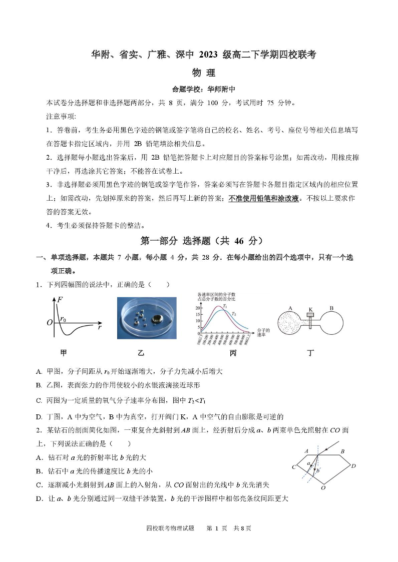 高二物理--广东省华附、省实、广雅、深中四校2024-2025学年高二下学期期末联考