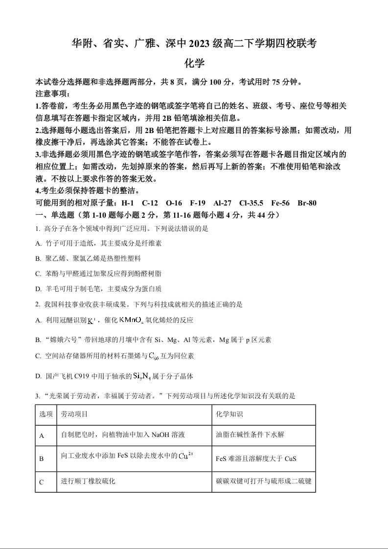 高二化学+答案--广东省华附、省实、广雅、深中四校2024-2025学年高二下学期期末联考