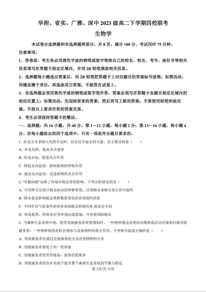 高二生物(原卷版)--广东省华附、省实、广雅、深中四校2024-2025学年高二下学期期末联考