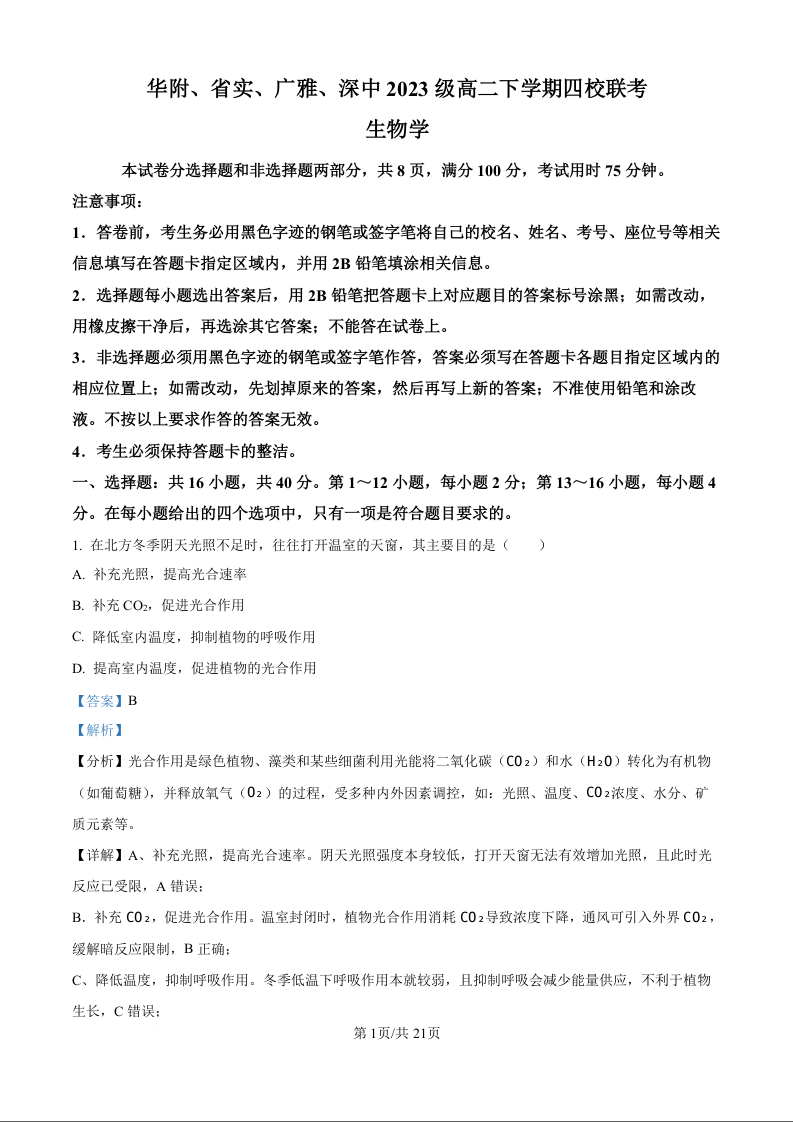 高二生物(解析版)--广东省华附、省实、广雅、深中四校2024-2025学年高二下学期期末联考