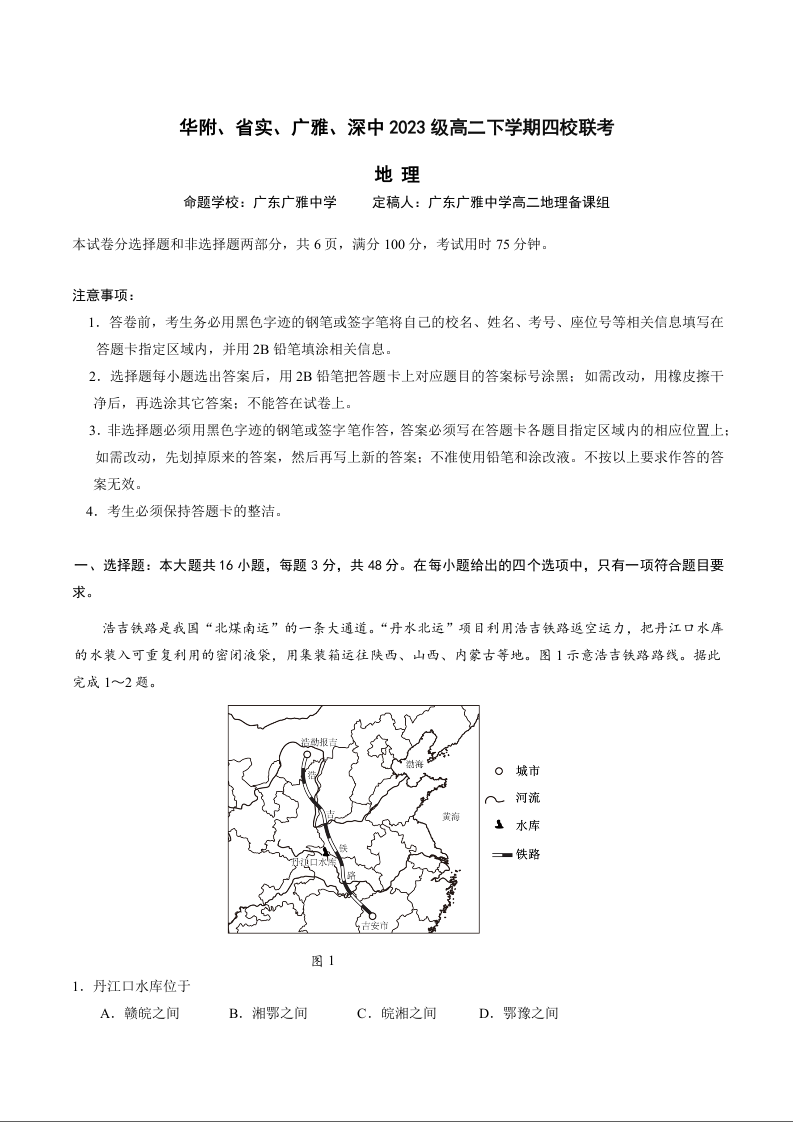 高二地理+答案--广东省华附、省实、广雅、深中四校2024-2025学年高二下学期期末联考