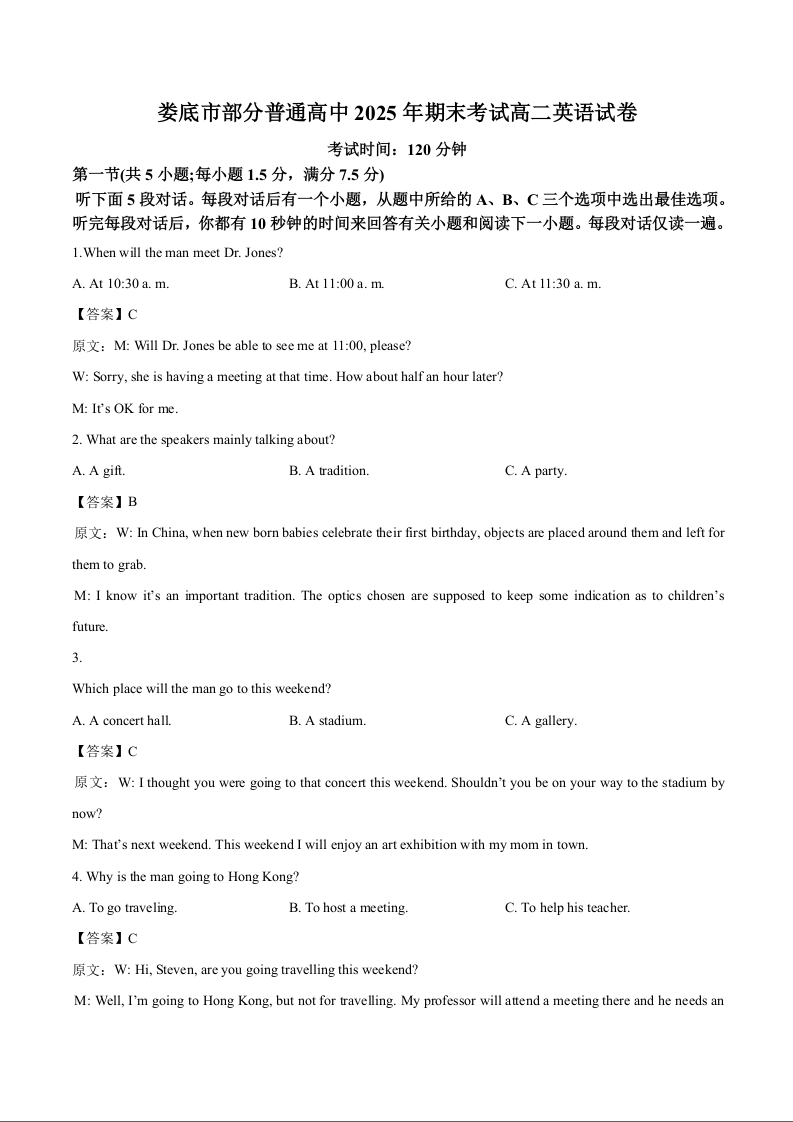 高二英语答案--湖南省娄底市部分普通高中2024-2025学年高二下学期期末考试