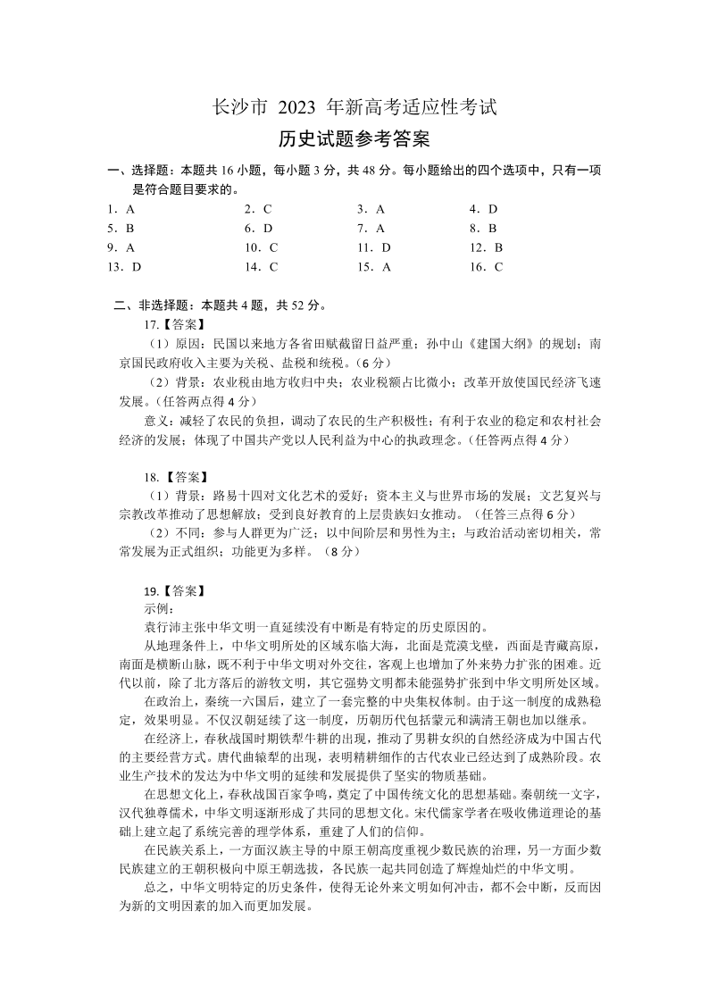 高三历史答案--湖南省长沙市2023年新高考适应性考试