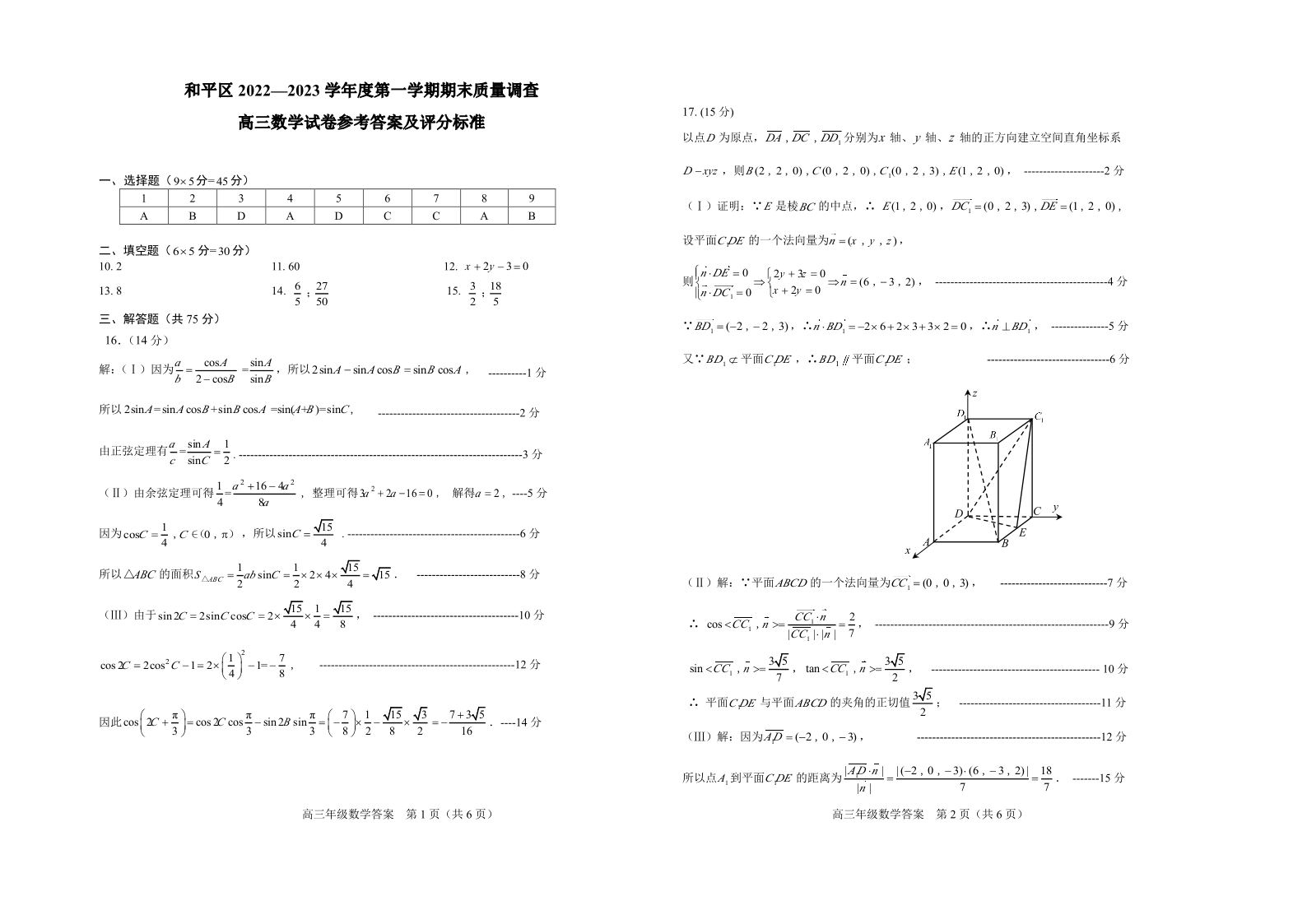 高三数学答案--天津市和平区2022-2023学年高三上学期期末考试