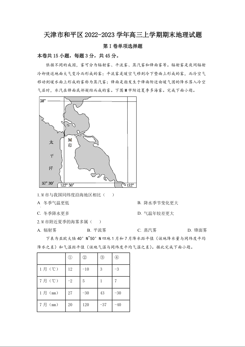 高三地理+答案--天津市和平区2022-2023学年高三上学期期末考试