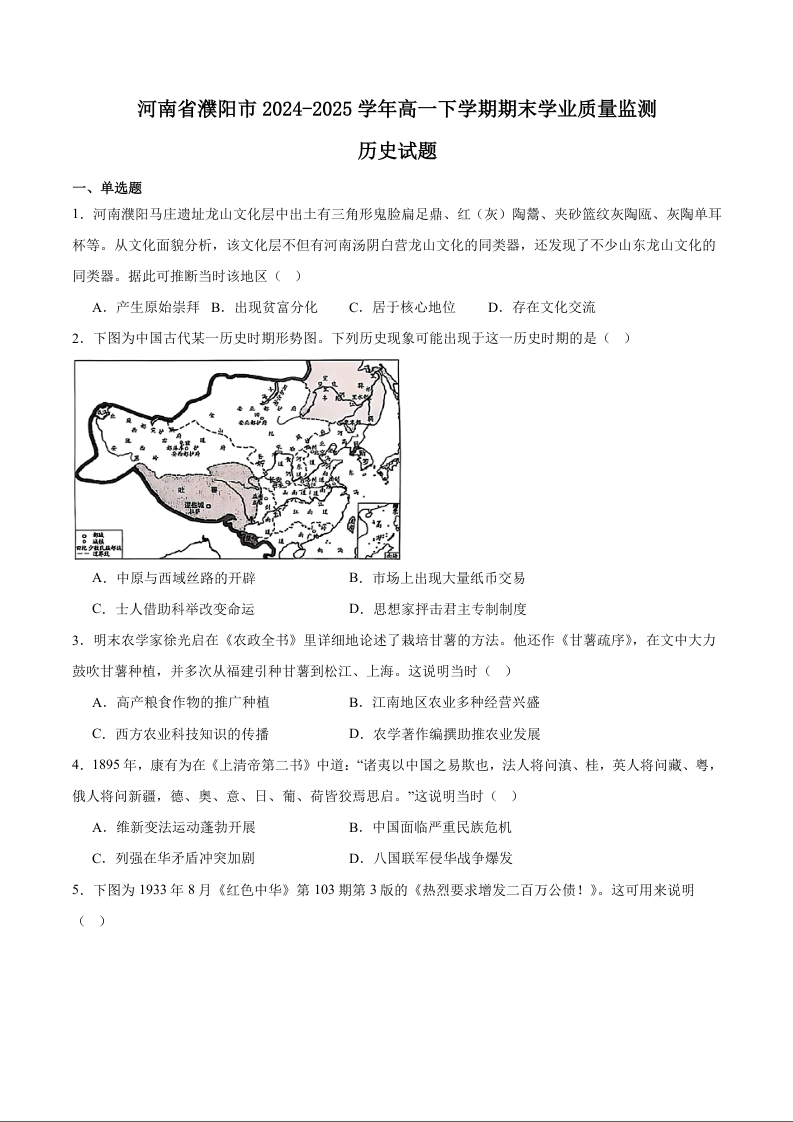 高三历史+答案--河南省濮阳市2024-2025学年高一下学期7月期末考试